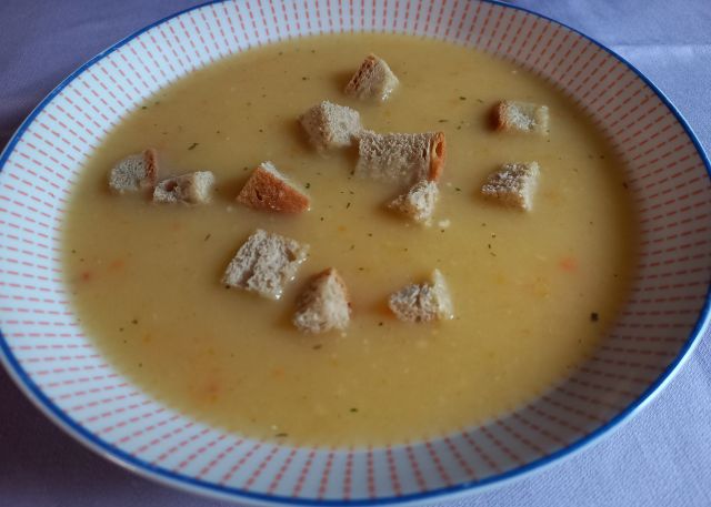Kremna juhica iz zelenjave, ki jo je treba porabit, narezana hrenovka