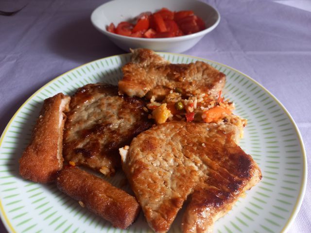 Juhica iz vrečke; ostanki mesa od včeraj; paradižnik