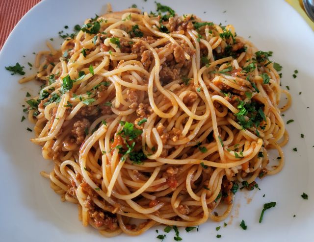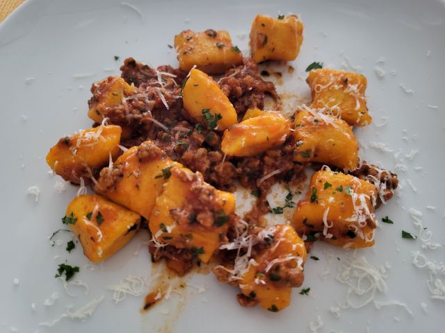 18.8. mesna omaka s špageti, zame z bučnimi njoki, solata