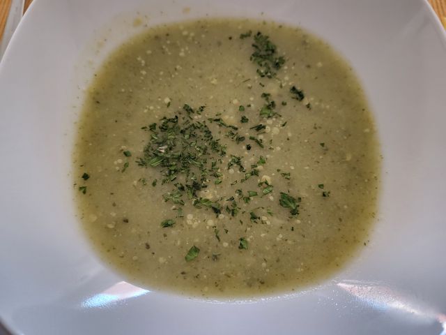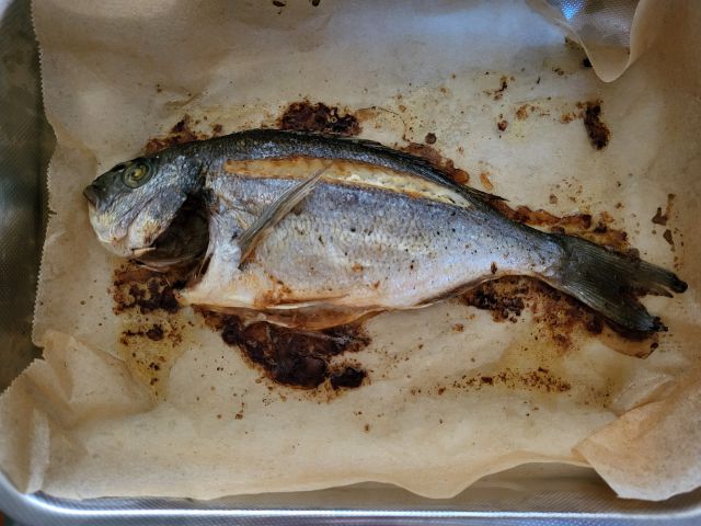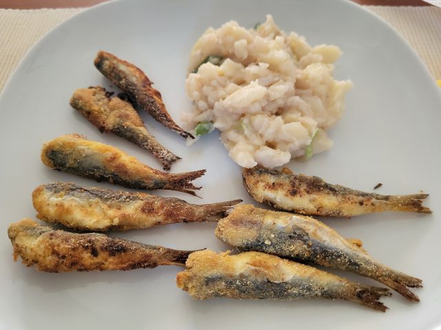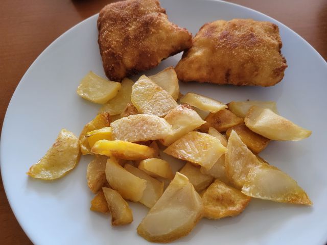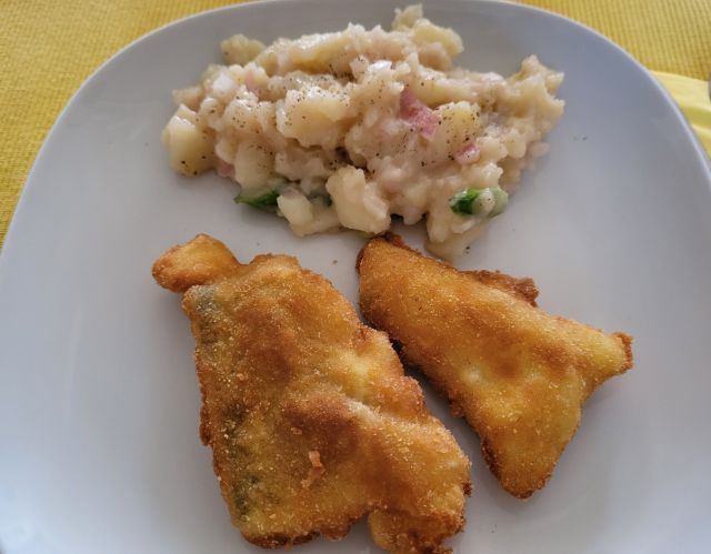 19.8 brokolijeva juha, moja dva ocvrt oslič, jaz orado, krompirjeva solata, pečen krompir