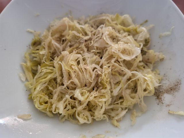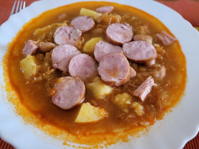 Tudi pri nas jota z zeljem, s šunko in kranjsko klobaso, kruh. Zaradi mene zgoščena samo s pretlačenim krompirjem.