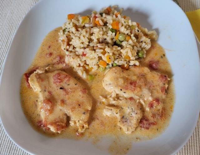 22.9 zrezki v omaki, zelenjavni riž, solata