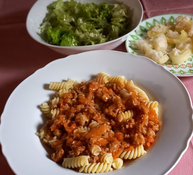 Svedrčki z bologneze omako; zelena solata paprika z zeljem