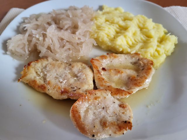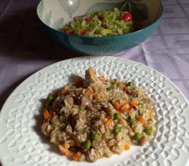 Piščančja rižota; zeljnata solata z rdečo redkvico