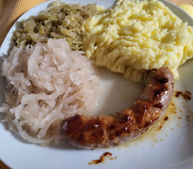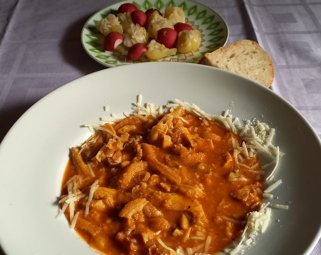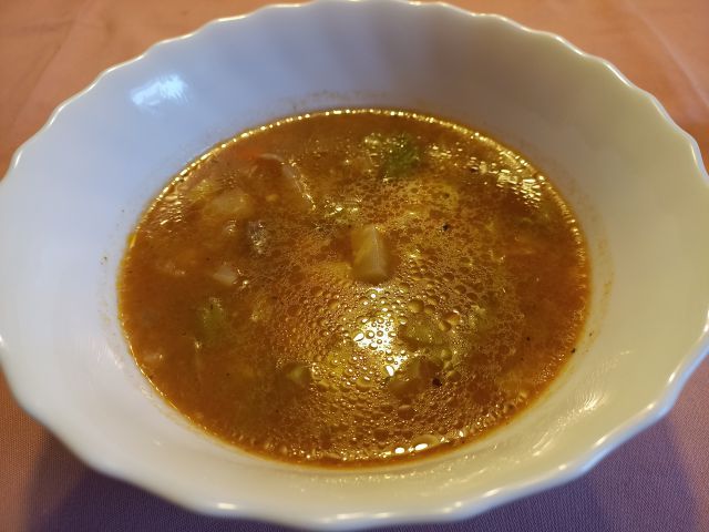 Torek: goveja juha s kroglicami, makaroni z omako džuveča in mletim mesom; bučna juha, motovilec