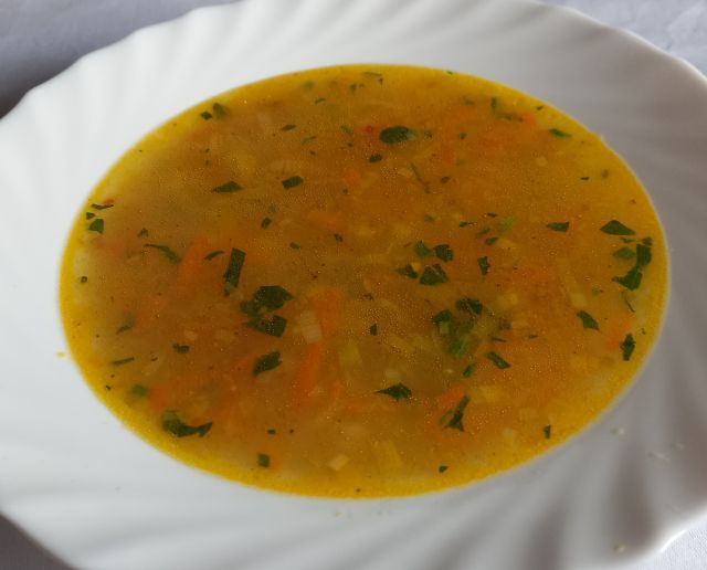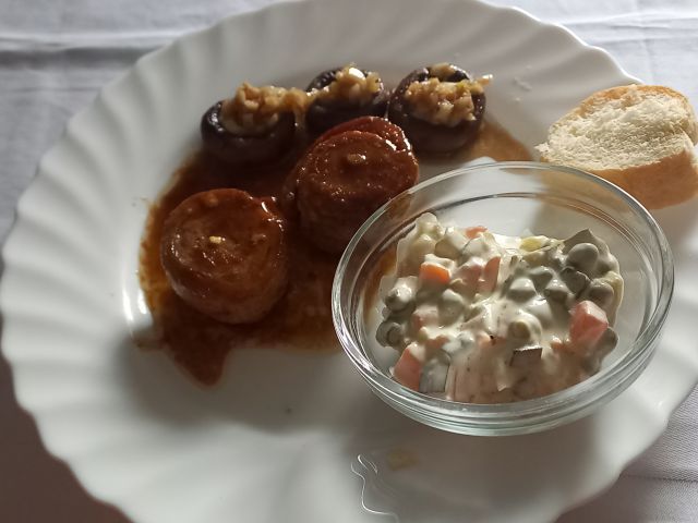 Porovo-korenčkova juhica, ostanki mesnih zvitkov, šampinjoni z veliko česna, francoska solata