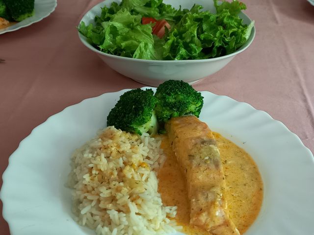 Basmati riž, losos v omaki, brokoli; zelena solata