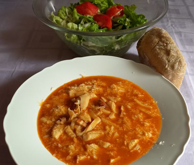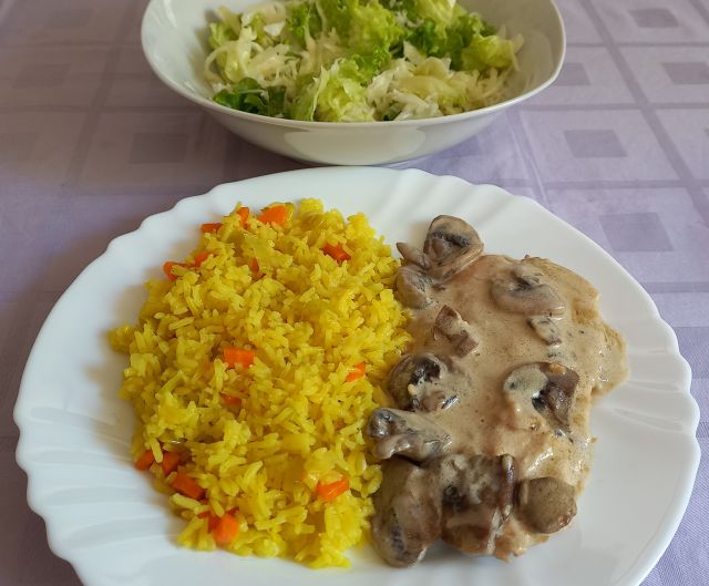 Goveja juhica; basmati riž, piščančji zrezek v šampinjonovi omaki, malo pohanja; zelena solata z zeljem