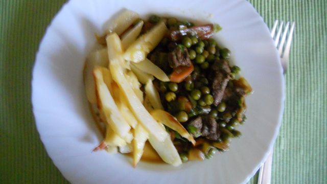 polarbearDanes: goveji koščki z grahom, pečen krompir, mešana solata