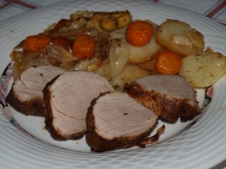 v pečici, z množico sveže zelenjave in začimb pečena