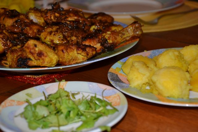 mali kuharPiščanec po zanzibarsko (pečen na žaru) in ocvrte krompirjeve kroglice, z istega otoka ( to smo jeldi v ponedeljek):