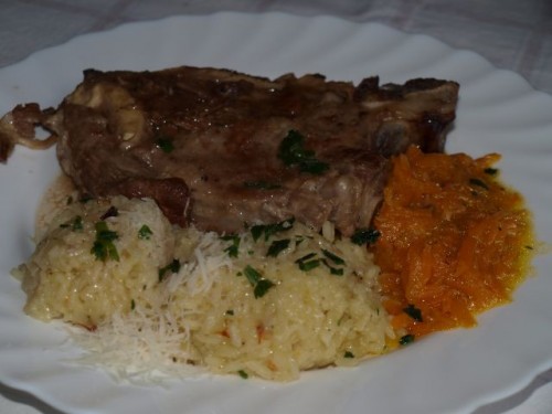 Kurja juhica (od včeraj); telečji vrat v omaki, dušen korenček, riž s parmezanom; zelena solata: