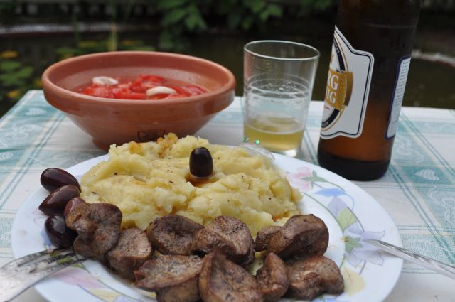 Danes: po dolgem času sva kljub slabemu vremenu zakurila žar; piščančje perutke marinirane z limetinim sokom in medom, piščančji zrezki s curryem, domači čevapčiči, popečeni jajševci in rdeča paprika, francoska solata, paradižnikova solata. Za posladek pa je žarmojster dobil nekaj nebeških poljubčkov (piškotkov seveda