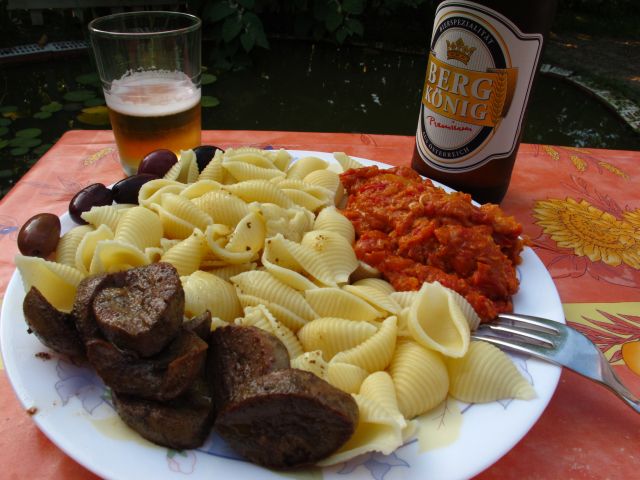 Danes pri nas: v pečici pečena mešanica koščkov paradižnika (3 sorte), rdeče paprike in česna, z bazilikinimi cverovi, poprom, soljo in koščki pancete, zamešano med bavete, posuto s parmezanom, zelen radič s fižolom in bučnim oljem.
