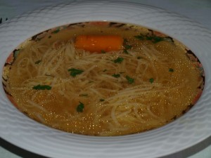 Goveja juhica z domačimi rezanci; pečeno piščančje bedro, "ščipanci", čebulno-korenčkova omaka; zelena solata: