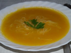 Zmiksana zelenjava v juhici; goveji zrezki v omaki, riž, zelena solata: