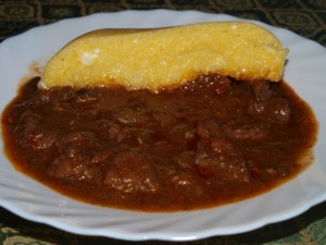 Goveji golaž, polenta, zelena solata, slani ptički: