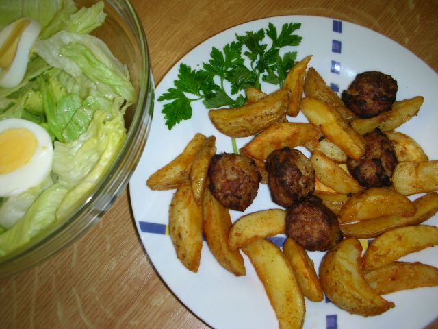 Oče/ krompirjevi popečeni svaljki, stročji fižol v masleno smetanovi omaki, mešana solata