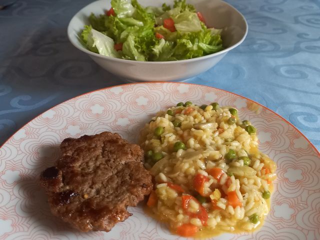 Zelenjavno-jurčkova rižota, mesni popečki, zelena solata s papriko in paradižnikom