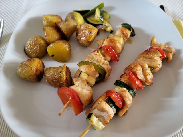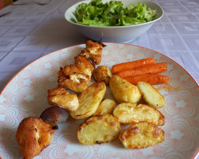 Piščančje nabodalo, pečen krompir, karameliziran korenček ; zelena solata