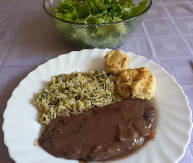 Milijonska juha; goveji zrezek v vinski omaki, basmati riž na poru, šampinjoni polnjeni z gorgonzolo in praženi v tempuri; zelena solata
