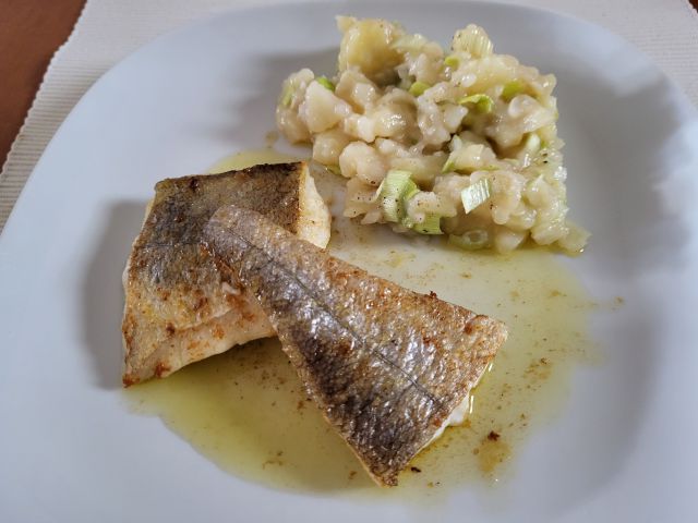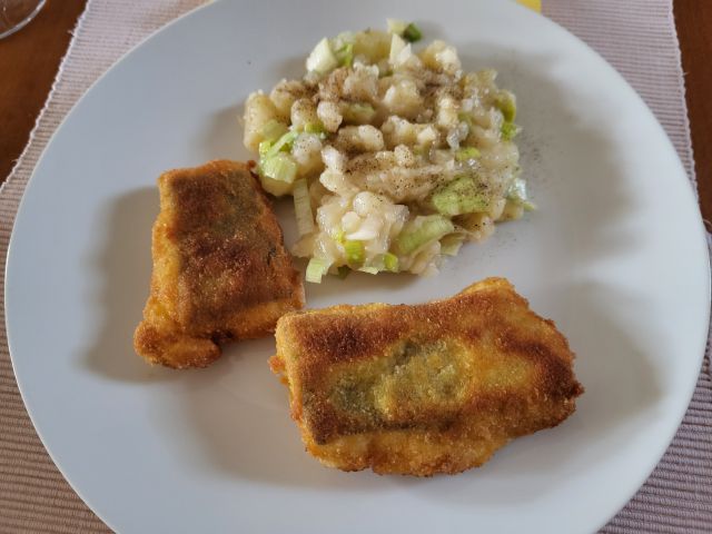 V petek sveži oslič po dunajsko, zame pečen, krompirjeva solata za naju. Za sina poleg ocvrtega osliča popečen krompir in kumarična solata.
