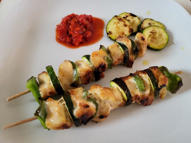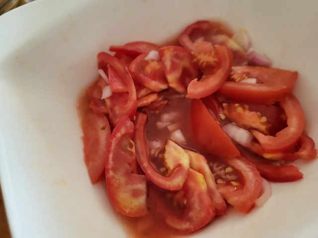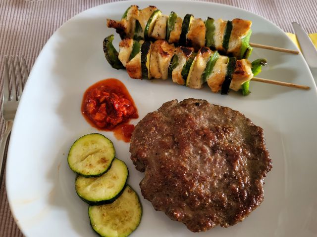 Včeraj pleskavice, nabodala, ostanki solat ( stročji fižol, krompirjeva), domač paradižnik v solati, ajvar, kruh