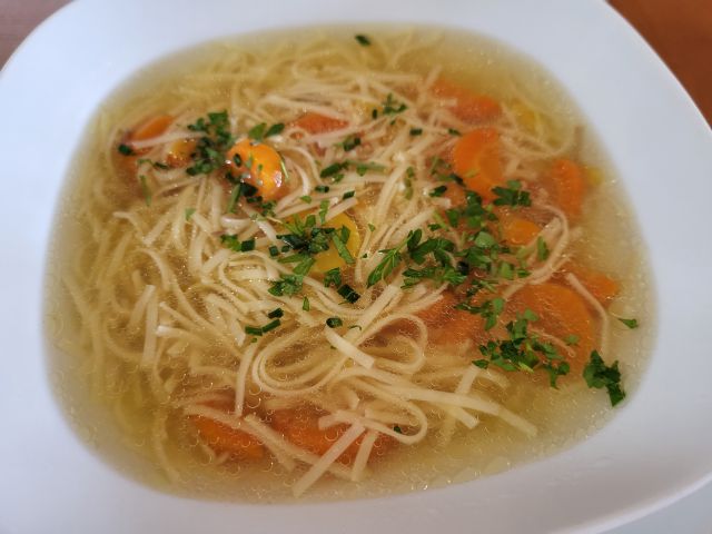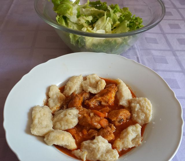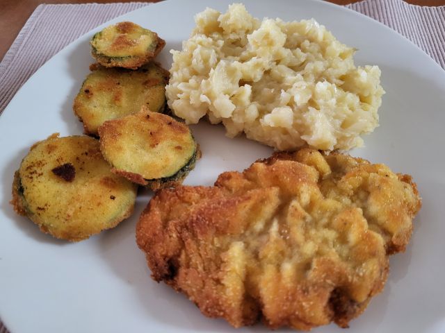 Danes goveja juha z rezanci, meso po dunajsko ( zame popečeno), pražen krompir, panirane bučke ( zame pečene), domača mešana solata