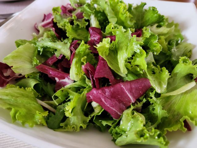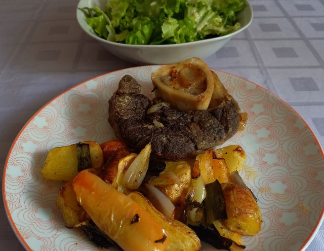 Goveja juhica; osso-buco s krompirjem in zelenjavo; zelena solata