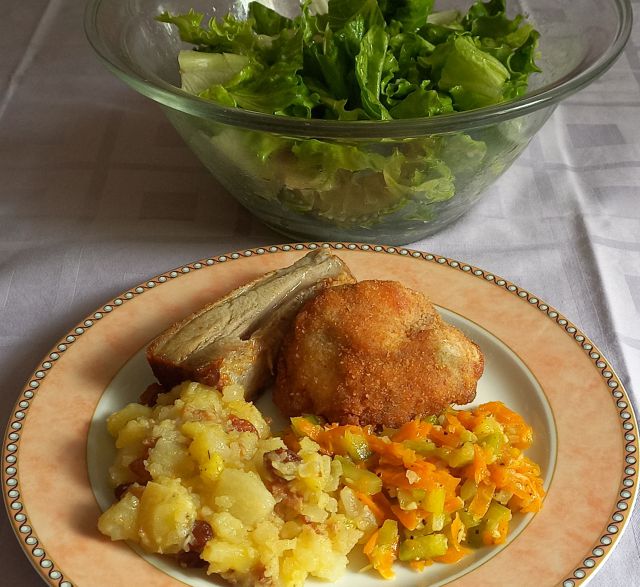 Pražen krompir, korenček in bučka v omaki, panirano piščančje in sv.rebro; zelena solata