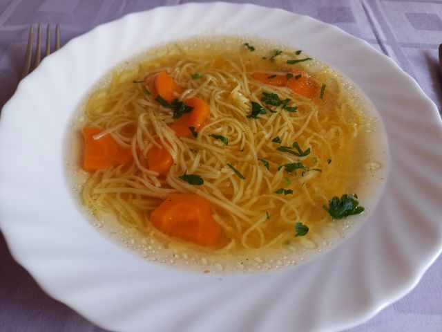 Sobota, goveja juha z rezanci čufti, pire, solata, kava