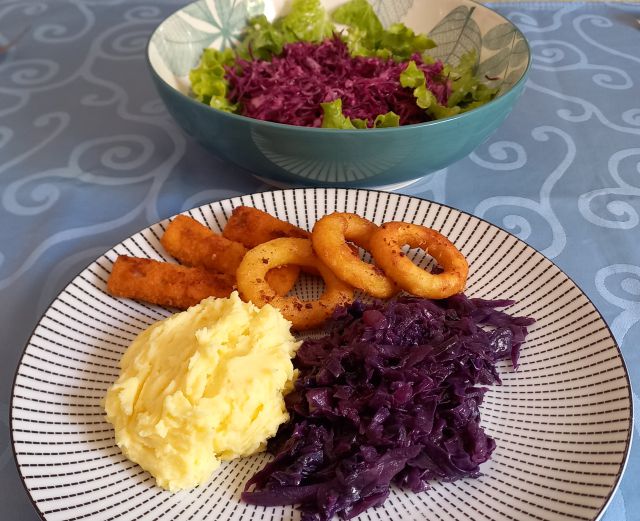 Juhica; pire krompir, tenstano rdeče zelje, ribje palčke, koluti kalamarov, zelena solata z zeljem; jabolčni štrudelj
