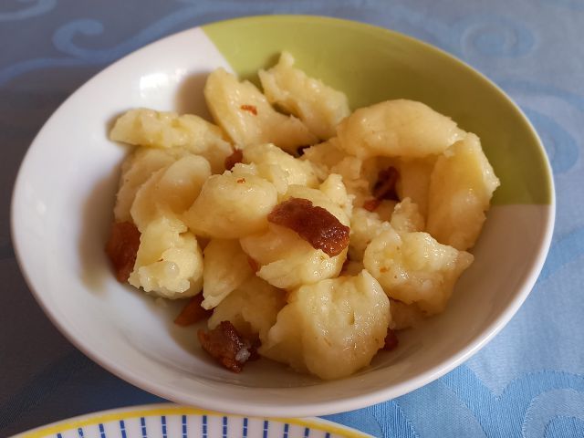 Petek: goveja juha z rezanimi palačinkami, kuhan krompir, losos, blitva, zelena solata