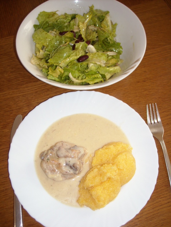 Piščančje meso v korenčkovi omaki, krompir v kosih, praženi šampinjoni (dobri za prste polizat), malo njokov, zeljnata solata. Za posladek vroča čokolada s smetano in čvek (ne na kulinariki