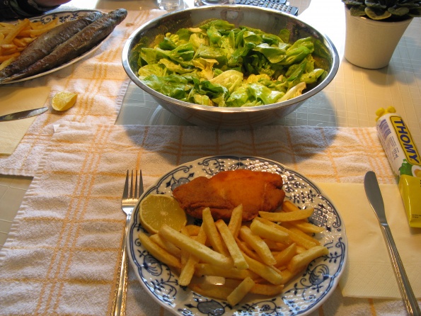 Zame pa ocvrt svinski zrezek, pomfri in velika skleda solate,sladica včerajšna torta
