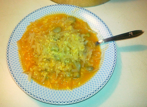Korenčkova juhica; makaroni z mesno-zelenjavno omako, radič in matovilec z nekaj zrni fižola: