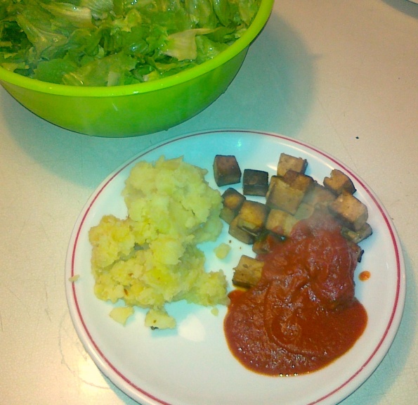 Danes.....mariniran tofu z medom in sojino omako, paradižnikova omaka, pražen krompir