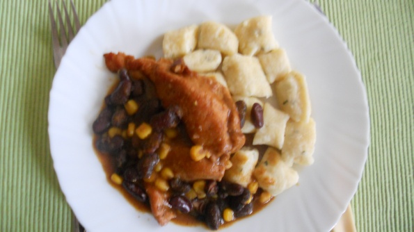 Včeraj smo imeli govejo juho z rezanci, riž, poln zelenjave in začimb, poleg pa na olivnem olju popečene svinjske kotlete in pršut ter mešano solato.