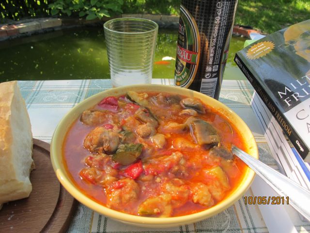 pol pa me nagovorijo, da pogledam na čvek pol pa sploh ne vem več kako in kaj. En cel let sem bil v tej rubriki najbolj reden, sploh ne vem če sam kakšen dan manjkal, računam, cel jedilnik ste mi spoznali, sedaj bi se le ponavljal. Moje kuhanje je pravzaprav ena taka klasika, rahlo se mi zdi podobno do neke mere kot pri dragočki: najmanj enkrat na teden mora bit kaj " na žlico ", pa raje dvakrat, enako je za ribe, pol kakšem kremenatlc in je teden okol in spet znova. Kot je mamamia nekje zapisala, se izogibam, da bi kuhal za zmrzovalnik, izjema je kakšen paprikaš ( piščančji/svinjski ) ki zelo pav pride, bodisi za rižoto, tedtenine, krompir čorbo............., pa sploh bi rad imel zmrzovalnik manj ali več prazen, ni ga čez frišno skuhano...........