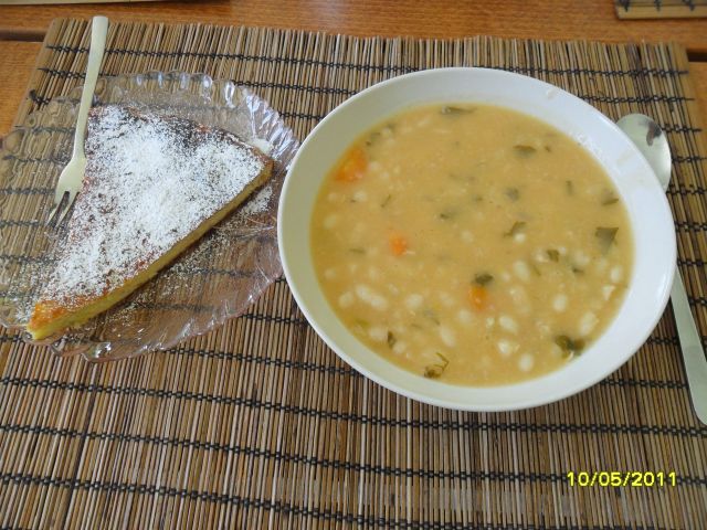 Skutno-jabolčna pogača in pasulj, za posladek pa ležanje v travi z našimi mičkenimi.