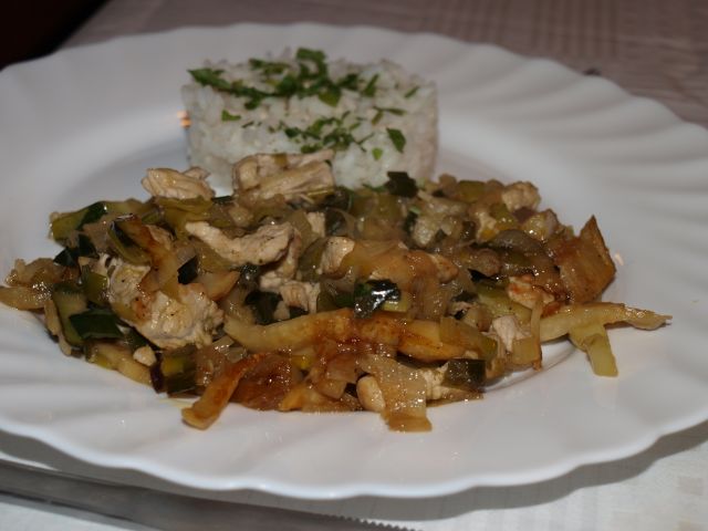 Goveja juhica z domačimi rezanci; piščančje in zelenjava v voku, riž; zelena solata: