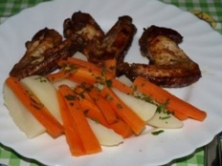 Goveja juhica /od včeraj/, pečene perutničke (marinirane), kuhan krompir in korenček; berivka: