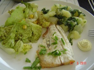 SašaVčeraj špargljeva juha, brancin, blitva s krompirjem, solata s koruzo in