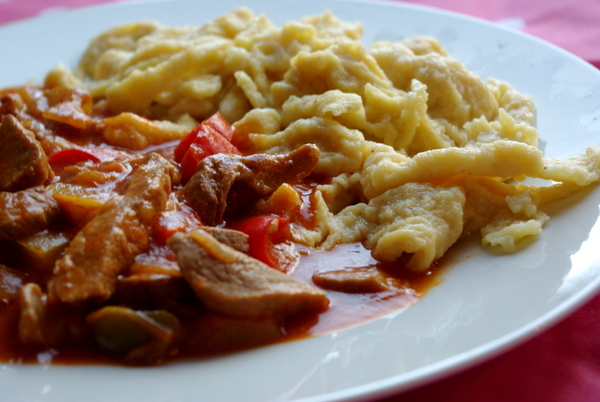 svinjina s papriko, ciganski vlivanci, skleda narabutane solate