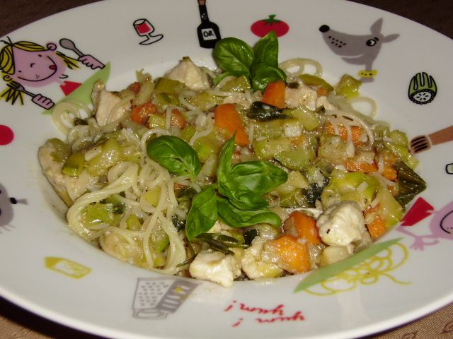 Špageti v zelenjavno-piščančji omaki, berivka z mlado čebulo, češnje: