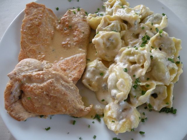 cervusTortelini v smetanovi omaki,piščančja prsa ,mešana solata!