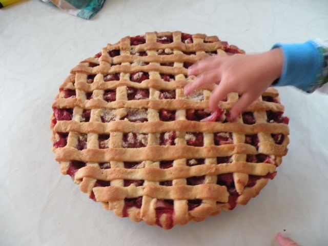 mzmNekakšne raztrgane testenine, prelite z mesnim hašejem in breskov kompot. Pa črne češnje, ravno pravšnje za majco popackat (kdor je pujsek, je pač pujsek