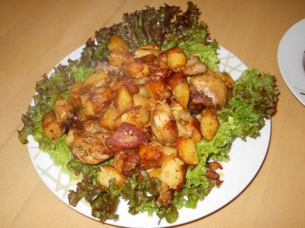 Danes: pražen krompir, svinjski zrezek v omaki iz jajčevcev (lastni izum) ter zelena solata s česnom.