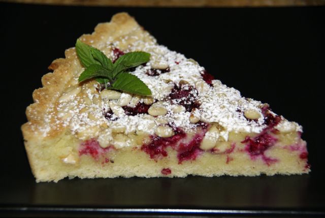 polarbearDanes: Sveži čarobni kruhki s piščančjo solato s pehtranom poleg zelene solate, z avokadom, seve. Torta (pita) z malinami in pinjolami za desert. Zadnje čase čisto preveč pečem. ![]()
