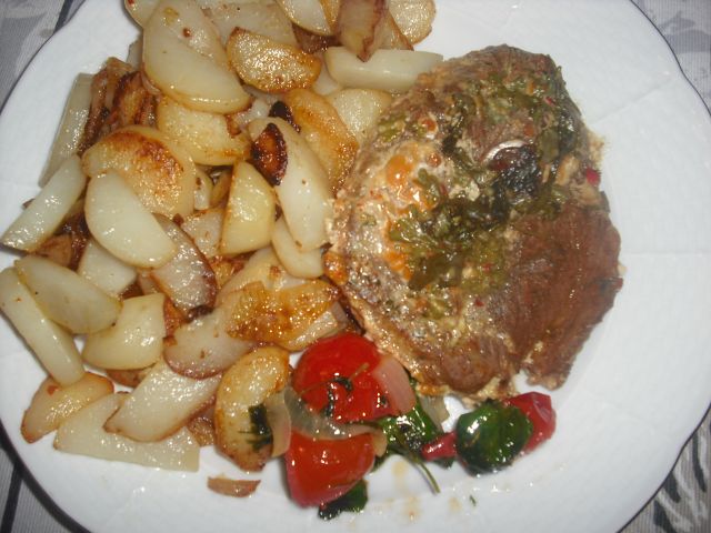 Danes: Peceni kosi jagencka, pecen mlad krompir in velika skleda solate.